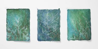 Through each line, each pen stroke, and every layer of color, emerge threads that connect the visible with the unseen, the dream with the natural landscape, forming an embossed memory. These works don’t merely depict nature—they dream it. Tree trunks, waves, bushes, and water unfold in a rhythmic dance of line and hue. The colors—greens, blues, earthy tones, and luminous whites—offer a quiet space for the eye to rest and the imagination to wander. Like woven threads, each element engages in a silent dialogue with nature, inviting us to reconnect with the organic motion of the world within.